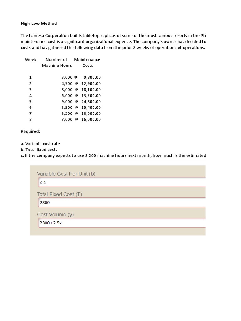 Month February Machine hours 6900 MOH6250 March Machine hours 5000 MOH 5375 April Machine hours 6300 MOH 6025 May Machine. View high low methoddocx from BSMA 401 at STI College multiple campuses. High low method 1 Machine Hours Maintenance Costs Highest observation of cost.